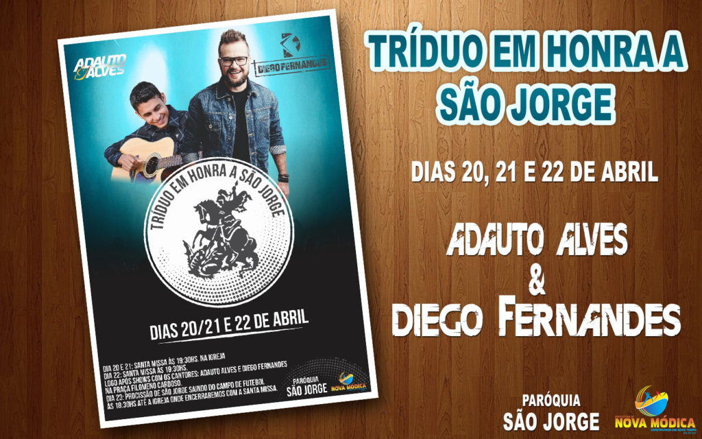 Nos dias 20, 21 e 22 será celebrada a Santa Missa na Paróquia São Jorge. No dia 22, logo após a Santa Missa, o terceiro dia de festa será encerrado com shows dos cantores Adauto Alves e Diego Fernandes na Praça Filomeno Cardoso.