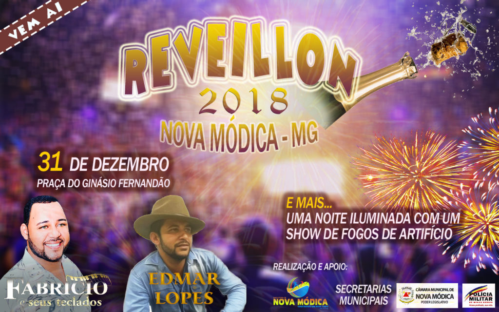 O Réveillon 2018 em Nova Módica será agitado. A noite do dia 31 de Dezembro não terá hora para acabar. A Prefeitura Municipal de Nova Módica tem a honra de convidar a todos para curtirem um grande noite com show artístico do cantor Fabrício e seus teclados e do cantor Edmar Lopes, fechando a noite com chave de ouro. E mais, a noite ainda será iluminada com um belo show de fogos de artifício.